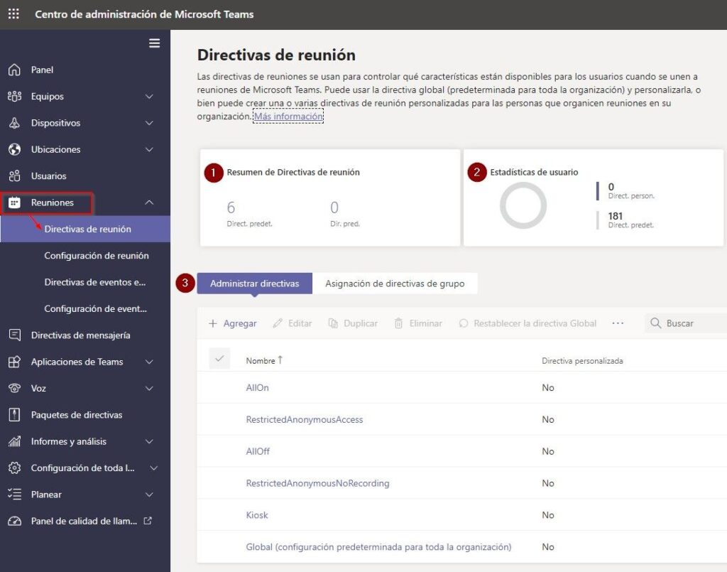 Haz click en “Reuniones” y luego “Directivas de reunión” en el panel lateral izquierdo, tal y como se muestra en la imagen. Una vez que entremos en la página de directivas de la reunión, podemos ver el siguiente informe: